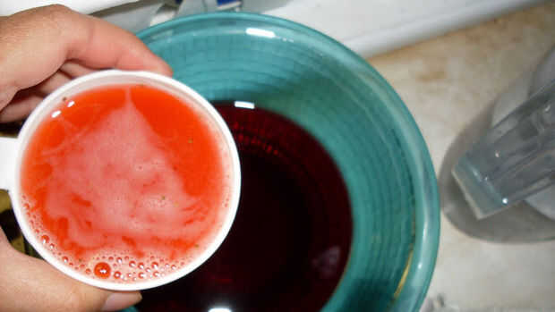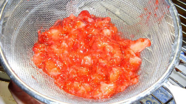 Colar las fresas y añadir agua en el jugo que sería aproximadamente 1 taza de jugo de