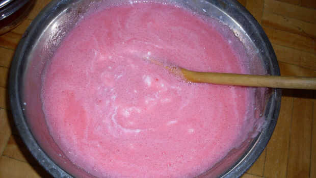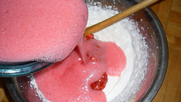 Añadir crema batida en batida Hola, sigue con el puré de fresas, doblez para combinar