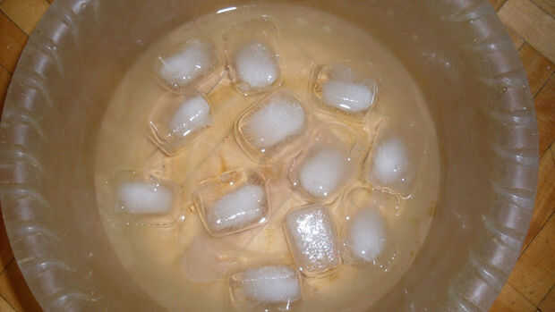 Coloque hielo en cubos en una gelatina grande tazón de fuente y lugar de la taza de cubitos de hielo, luego batir hasta que esponje