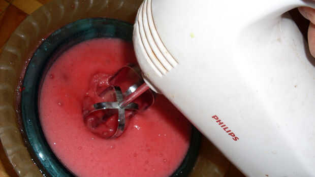 Mezcle jugo de fresas con gelatina y enfriar en el frigorífico durante 15-20 minutos, un poco al firm.