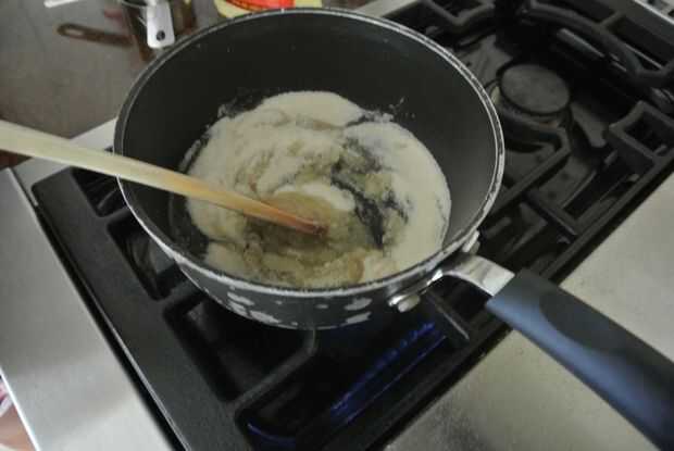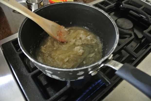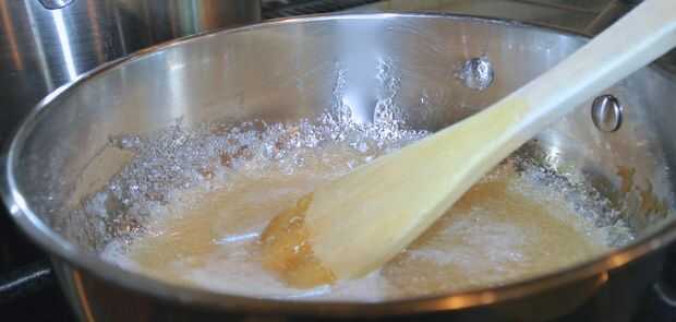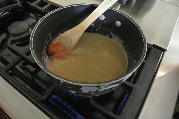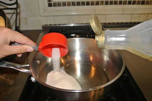 Disolver el azúcar en el jarabe de maíz a fuego lento, revolviendo de vez en cuando. Aumentar el calor a medio-alto y revuelva constantemente, asegurándose de que no se queme. Si se evapora demasiado rápido, añadir agua o más jarabe de maíz.