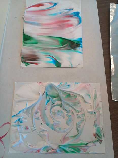 mi sobres se crean con pinturas de crema y tintes o acrílico de afeitar. Usted necesitará una bandeja de 9 x 13 en el que se pone crema de afeitar para cubrir la parte inferior y tinte (me gusta usar colorantes de alimentos) o pinturas acrílicas y ar