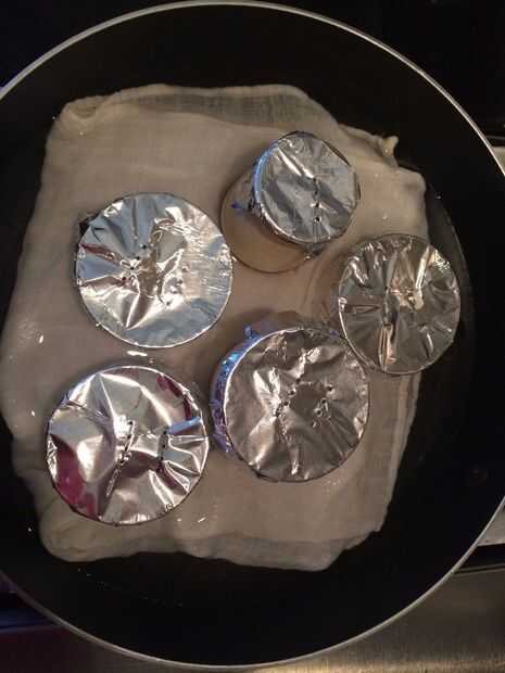 En una olla grande y profunda, verter en 4 cm de agua y coloque un pedazo de estameña o paño de cocina limpio en la olla. Coloque los moldes en el agua. Asegúrese de que el agua está a medio camino hasta los moldes. Cubrir la olla con una tapa y calor a medio-alto y un cronómetro. Una vez que el agua comienza a hervir, gire el calor a medio-bajo y continuar la cocción hasta que el cronómetro Lee 8 minutos. Sacar los moldes de la olla, retire la lámina de estaño y el flan está listo para servir. Bon Appetite!