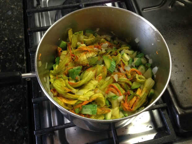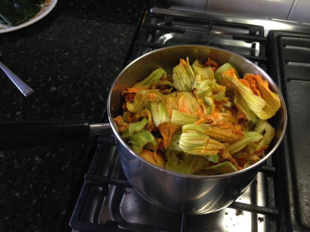 Después agrega la flor de calabaza y revuelve hasta la flor se haga compacta, hijo como 2 minutos.