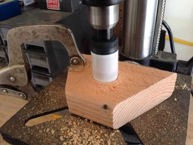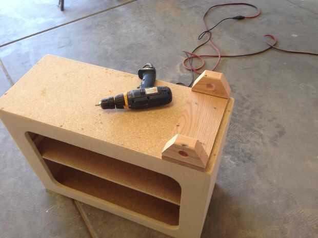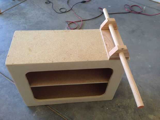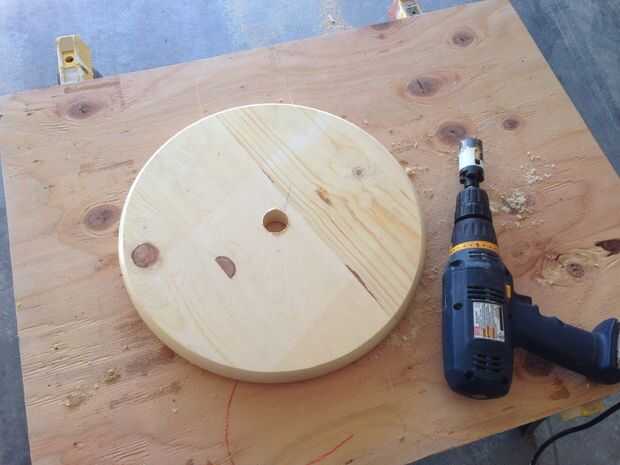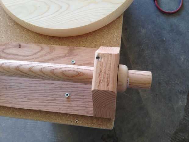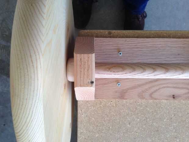 Volteado la estantería en la parte superior y me fui a trabajar en las ruedas. El plan era originalmente incluir alambre habló ruedas de su bicicleta, pero aunque los dedos de mi hija podrían quedar aprisionados en ellos. Inglete dos pequeñas secciones de 2 x 4 y me perforó un agujero de 1 1/4" a través de ellos. El eje es solo un pedazo corto de pasador que conseguí en la ferretería. Las ruedas son dos 15" inacabado tableros de la tienda de hardware también. Creo que fueron una pieza $8,00. Taladré un agujero en el centro de los así. Una vez que obtiene pintado todo y poner las ruedas en forma permanente no quería que las ruedas rocen con los costados del carro y arruinar la pintura así que añadido a espaciadores en cada lado para mantener las ruedas hacia fuera lejos de la cesta. Los espaciadores son en realidad un conjunto de soportes de madera que se emplean para instalar una ropa que cuelga en su armario la barra. Sólo taladré un agujero en el medio que era del mismo tamaño que el axel.