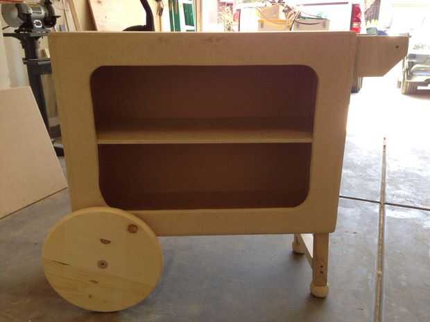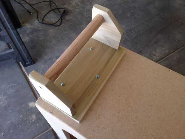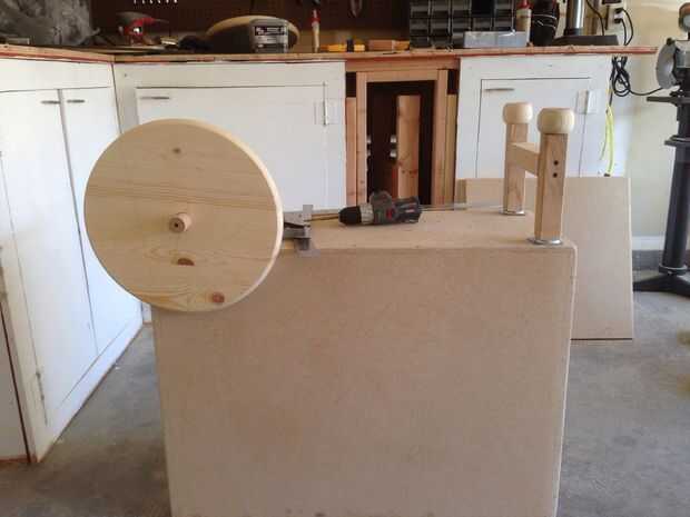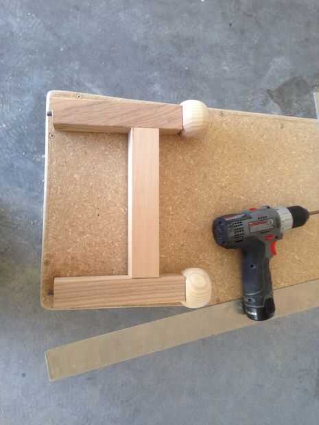 El mango es un simple montaje que hice por separado y luego atornillados a la estantería. Se compone de unas pocas piezas de chatarra de roble 3/4" y de la espiga sobrante desde el eje. Compré dos piernas de los muebles sin terminar en la ferretería pero terminan siendo demasiado corta para nivelar la plataforma, así que tuve que comprar los dos pies de muebles redondo así y agregar a la parte inferior. Vi que las piernas van a estar inestable así que agregué una barra transversal a la Asamblea para fortalecerla. Con todos los componentes principales hechos I seco ajuste las patas y las ruedas en que pude confirmar que todo se veía bien antes he pintado.