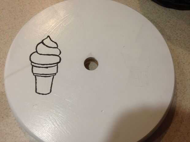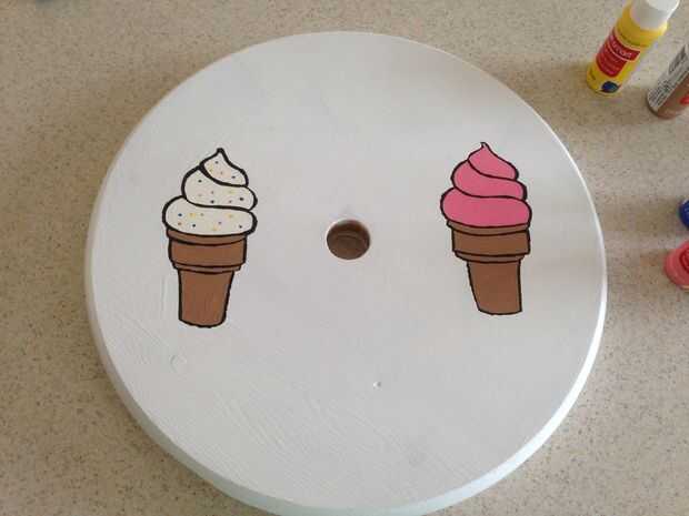 La habitación de mis hijas definitivamente tiene un esquema de color que tenía que cumplir. Todos los muebles son blancos. La biblioteca tuvo que ser blanco. Después de unas cuantas capas de pintura en el carro y las ruedas que quería añadir un poco de color, así que pinté los tapacubos y las patas de color púrpura. Luego pinté algunos conos de helado en las ruedas.