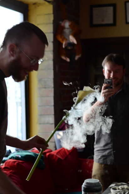 2. con el LN2 en un dewar pequeño, Vierta lentamente el LN2 en la mezcla. Revuelva suavemente. Golpe en el humo para que puedas ver lo que usted está mezclando (y wow la audiencia que ha crecido alrededor de la mesa a la vista de humo por todas partes).
