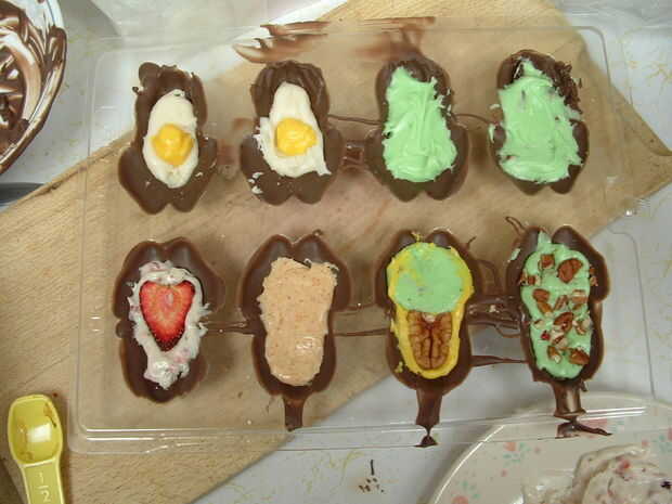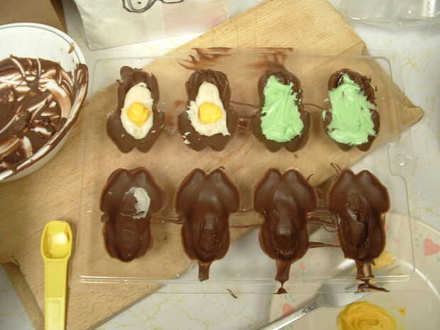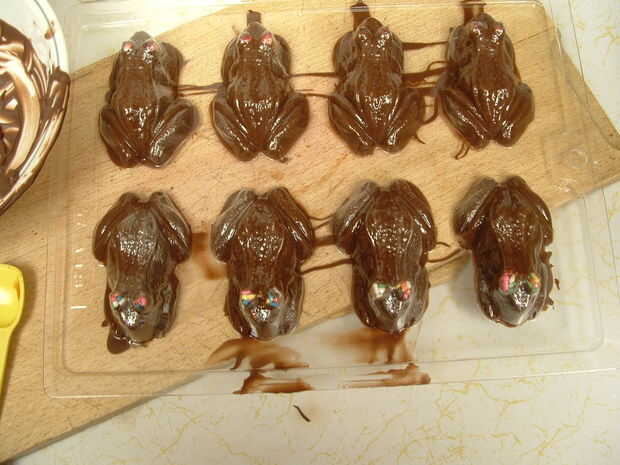 Qué es, indicaciones de Schoochmaroo maravilloso para hacer la crema de huevo de Cadbury, instrucciones aquí, solamente hice un medio lote, porque no pensaba que necesitaba un montón para las ranas. Todavía tenía cierta izquierda encima cuando me cansara, probablemente lo suficiente como para hacer una segunda bandeja. Llene que su rana de chocolate moldes con su remolino de chocolate, el chocolate alrededor hacer una concha de chocolate, y llenar con su imitación nata de Cadbury. La diversión es parte, usted puede condimentar esta crema forma que desee, aunque entonces por supuesto no saben igual que los originales. Dependiendo de su molde, también puedes darle a tus ranas ojos diferentes para ayudar a distinguir rellenos. Usé granas y trocitos de fresas deshidratadas, pero también he utilizado pastillitas rojas. Vierta una "tapa" en él, y listo! (Bueno, vale, después de esperar y dejan enfriar, pop de los moldes, recortarlas y empaquetarlos. :) )