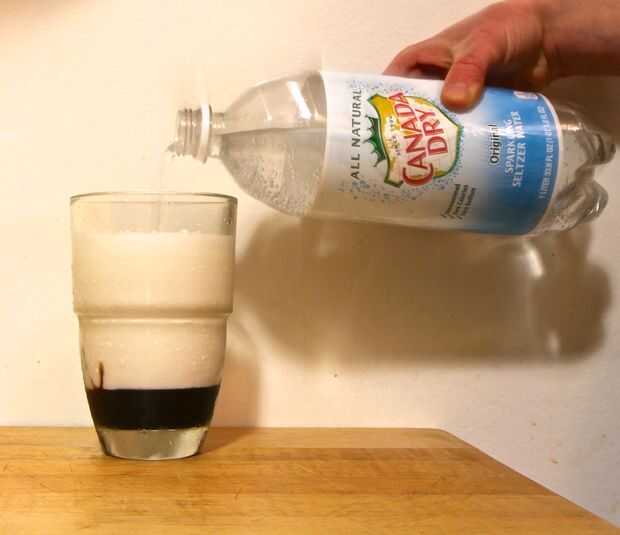 Vierta en el agua de seltzer, dejando por lo menos una pulgada en la parte superior de la espuma y la espuma como el agua de seltz y reaccionar la leche.