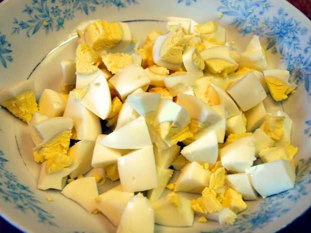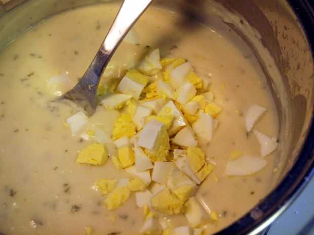 Cáscara de sus huevos duros y cortar en pedazos pequeños luego agregarlos a la salsa de la mezcla y revuélvalos en. Ser suavemente para no romper las yemas de a mucho.