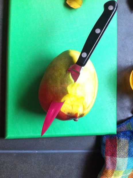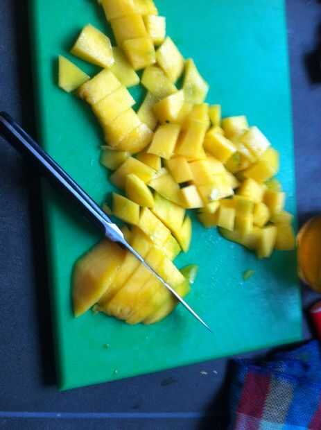 Schälen Sie die Mago, schneiden Sie sie en kleine würfel und geben Sie die Stückchen en eine kleine Schüssel.