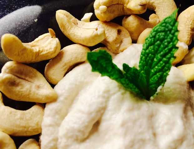 Poner los anacardos remojados en la licuadora, junto con una pizca de sal, el jugo de limón 1/2 y 1/4 de taza de agua.