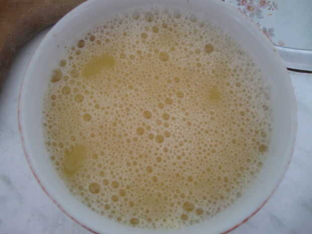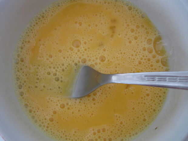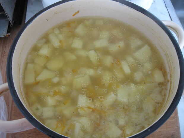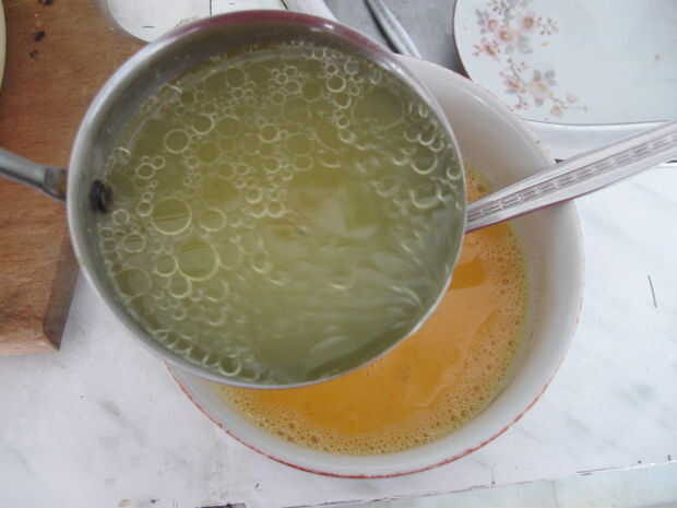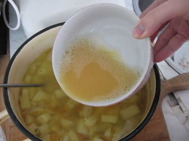 Mientras que revuelve el huevo, poco a poco añado agua (sólo agua, no patatas) de la sopa. Estoy agregando agua hasta que el recipiente quede completo. Luego agrego el huevo en la olla con los otros productos.