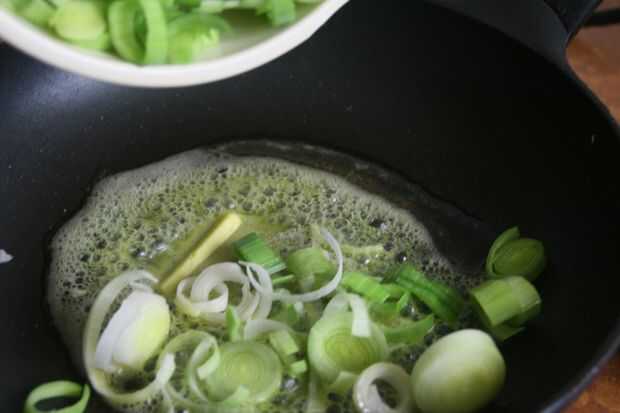En una sartén grande, derrita la mantequilla a fuego bajo. Agregue los puerros en rodajas (y setas si agregarlos) y cocinar suavemente durante 4 o 5 minutos, revolviendo ocasionalmente.