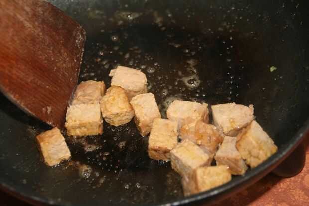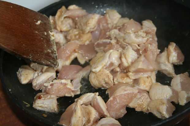 Volver la sartén al calor (puede que necesite un poco más de mantequilla) y cocinar el pollo. Antes de cocinar el pollo, yo mezcle algunos cubitos tempeh para dorar en la sartén primero, y luego cuando eso se hace, cocino el pollo.