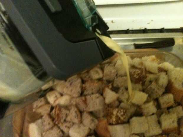 4. Mezcle la mezcla de huevo y el pan.  Usted podría lanzarlas en un recipiente o simplemente pobre la mezcla de huevo sobre el pan en una bandeja para hornear de 9 x 11.