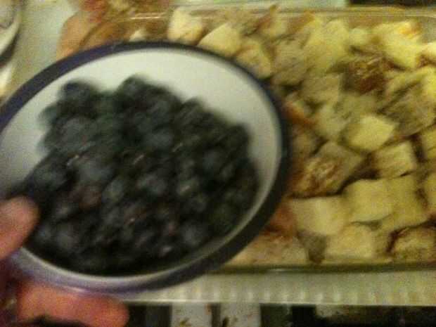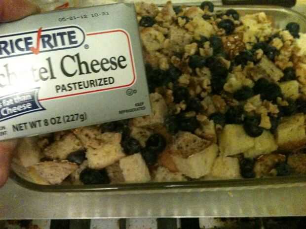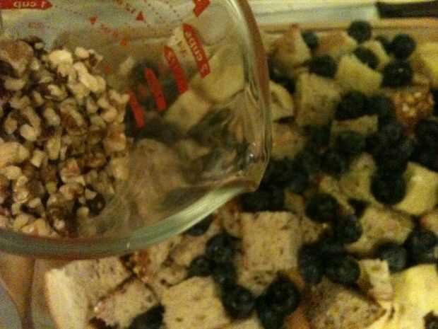 5. Mezcle en arándanos.  Espolvorear sobre las tuercas.  Corte o cucharada queso crema gotas en.