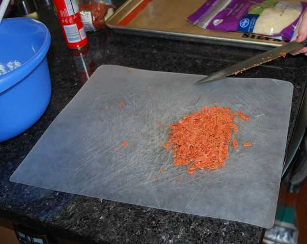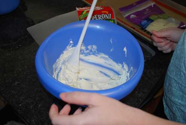 1. programar el horno a 375° F a caliente. 2. Coloque el bloque de queso crema en el Bol. 3. ablandar el queso crema revolviendo con la cuchara. 4. lugar 20 Pipi en el corte del tablero y cortarlas en piezas finas. 5. Mida 3/4 taza de queso de pizza.