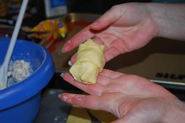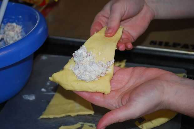 8. Abra los rollos de media luna y difunde hacia fuera en el tablero de corte. 9. cuchara de 1/8 de la mezcla de queso crema sobre el extremo ancho de cada una de la media luna rollos. 10. Envuelva cada rollo media luna alrededor del relleno de queso crema y presione los bordes para sellarlos.