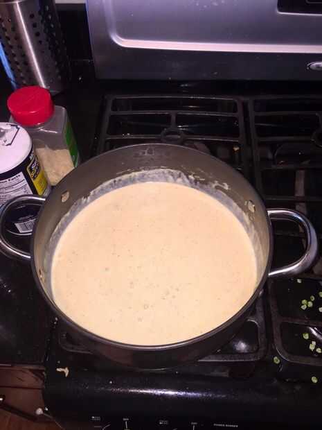 Añadir la harina, revolviendo constantemente. Poco a poco, agregar la crema, continuar revolviendo.