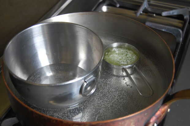 En un recipiente pequeño como una taza medidora de acero inoxidable, combinar aceite de semilla de ewax y uva. Calentar en una olla de hervir agua hasta que la cera se derrite y revuelva hasta que los ingredientes se combinan muy bien. En la misma olla de hervir agua, pero en un recipiente aparte caliente el agua para que el aceite y el agua lleguen a aproximadamente la misma temperatura.