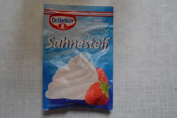 -1 paquete de sahnesteif, se trata de un polvo de almidón que ayuda a mantener la estancia crema chantilly batida, si usted no puede encontrarlo, simplemente hazlo whitout