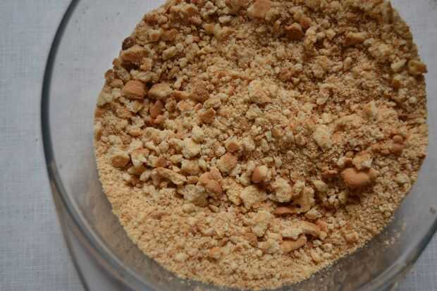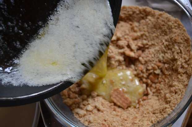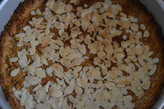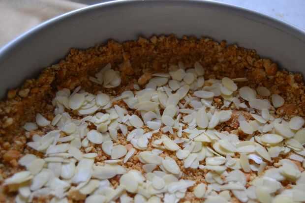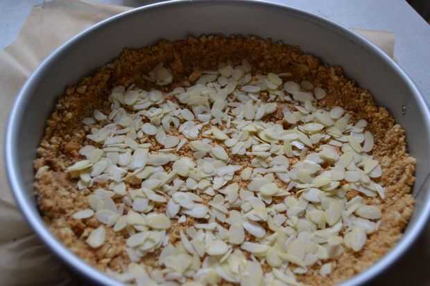 machacar las galletas en migajas pequeñas y ponerlas en un bol. derretir la mantequilla y mezclar con las migas. Presione la mezcla de la miga en una tartera, o si, como yo, no tienes una tartera de utilizar otro tipo de molde para pasteles, como una forma de primavera más o menos. alrededor de la parte inferior Pulse la corteza alrededor de 2-3 cm de altura a lo largo de los lados de la olla. Espolvorear la masa con almendras fileteadas.