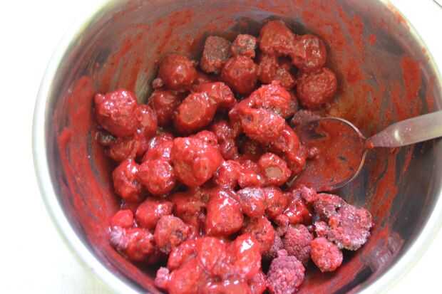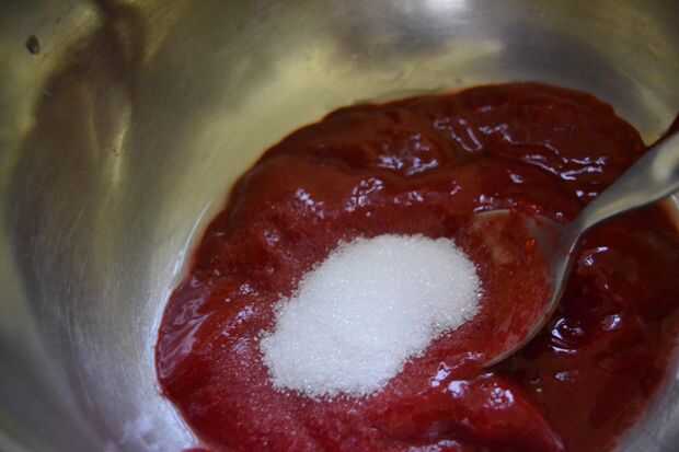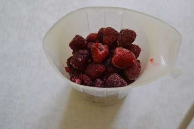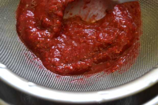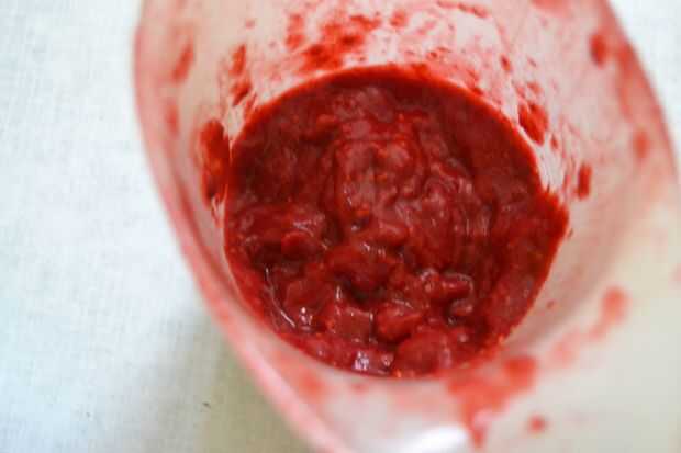 ahora mezclar el resto de las frambuesas con la salsa, si utilizas frambuesas congeladas es mejor si las frambuesas mezcladas en siguen congeladas, ya que serán menos moretes.