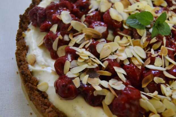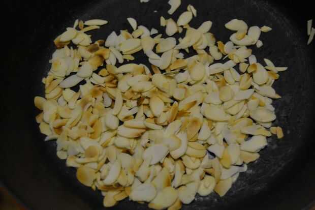en una sartén seca, tostar algunas almendras en rodajas más hasta que doren y espolvorear encima las frambuesas.
