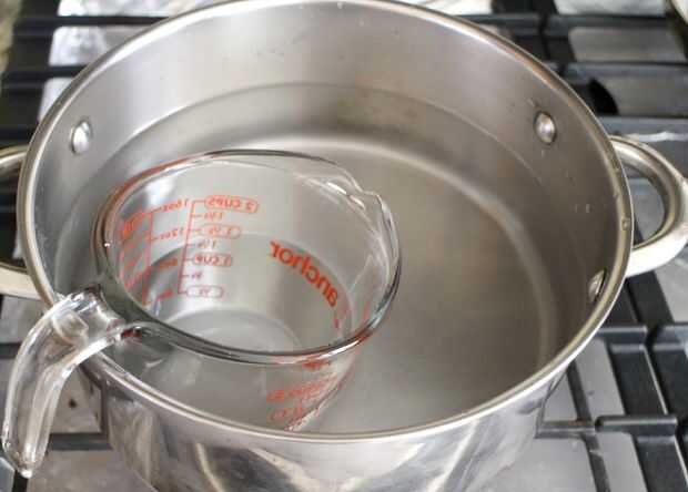 Yo realmente no tenía una caldera doble, así que makeshifted por relleno salsa regular de pan con sobre una pinta de agua. Entonces sólo enganchado en un vaso de medir hasta el labio de la cacerola, y hay que ir, caldera doble instantánea! Ahora la crema puede calentar para arriba en la taza de medición debido al agua hirviendo en la cacerola sin el temor de que quema.