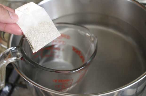 Con mi sistema de baño María, he añadido en el aceite de coco y el bolso de té de manzanilla. Te dejo estos dos ingredientes empapar por 10 minutos, una vez que un color se comenzaron a instalar por el bolso de té.