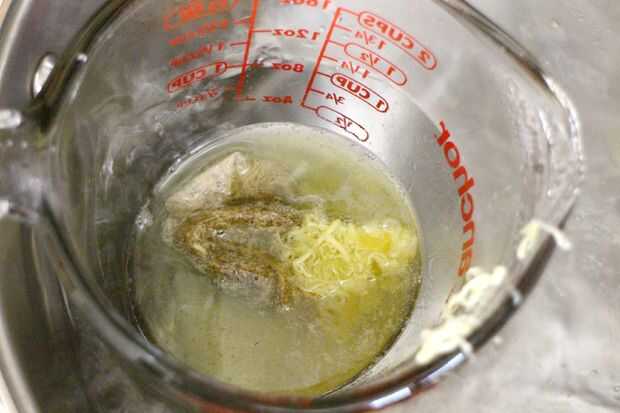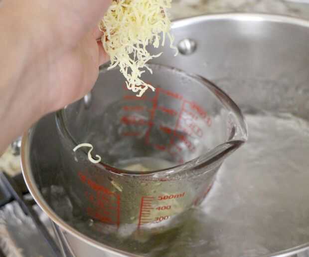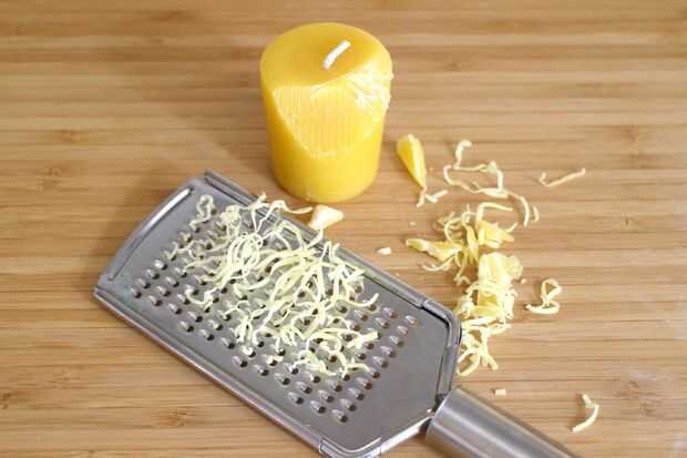 Con un rallador, ralladura de tanta cera como yo pensaba que necesitaba (sobre un 1/2 oz). También puede cortar pedazos de la cera y arrojar la caldera doble, pero la cera rallada se derretirá más rápido. Revolver de vez en cuando para asegurarse de que la cera se está incorporando bien.