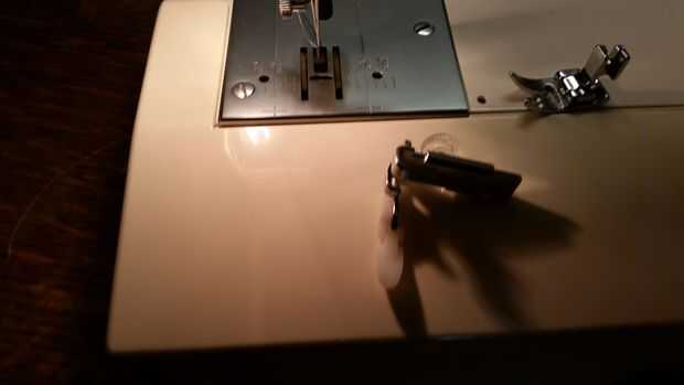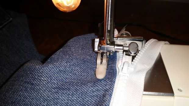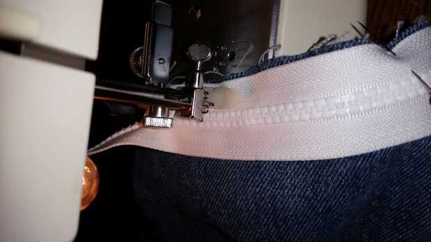- En algún momento el tirón de la cremallera se va a poner en el camino de la pata de cremalleras. En ese momento debe detenerse en un punto cuando la aguja está en la tela y luego levante el pie prensatelas (desbloquear su almeja/palanca). Ahora habrá espacio para tirar del tirador de cremallera pasada la aguja desabrochando la cremallera. Luego ponga el prensatelas hacia abajo.