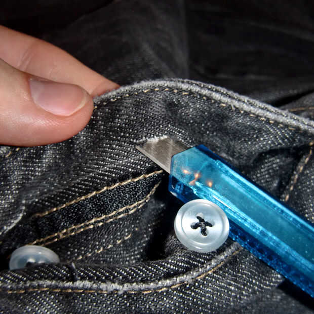 Se dobla la aleta superior de la mosca de jean, lo que es una doble capa de mezclilla. Línea de la ubicación de los botones cosidos en el interior de la aleta superior y luego realizar una pequeña incisión en el interior de la tapa superior, cuidadosa de no cortar a través el dril de algodón exterior (que sería visible al exterior). Su apertura debe ser ligeramente más grande que el diámetro del botón.