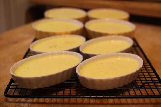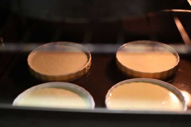 Vierta la crema en recipientes individuales, colocar los moldes en una fuente para horno y agregue bastante agua en el recipiente hasta que quede a la misma profundidad que su flan.  Hornear durante unos 25 minutos, hasta que la natilla se encuentra solo.  Utilizar una espátula de metal para recuperar los moldes y ponerlos sobre una rejilla para enfriar.  Envolver en plástico y pegarlas en la nevera durante la noche.