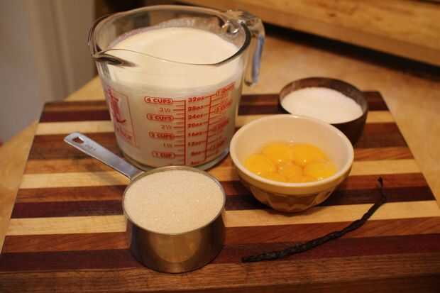 Reunir los ingredientes.  Precalentar el horno a 325 * F.  Dividir la vainilla longitudinalmente, ponerlo junto con la crema, media taza de azúcar y una pizca de sal en una salsa de pan y llevar a fuego lento.  Deje que se empinada durante 15 minutos y luego atemperar las yemas de huevo en (batir las yemas añadiendo un poco de líquido caliente en un momento así que traer lentamente las yemas a temperatura sin terminar con huevos revueltos).