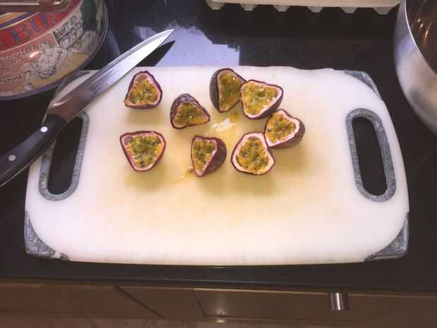 Así que haber comprado la fruta de la pasión y el hogar devuelto, cada una de ellas cortada por la mitad y saque todas las semillas y el jugo en un tazón. Que desee tanto de ese delicioso sabor para incluso ir hasta el punto de raspar algo que termina en una tabla de cortar.