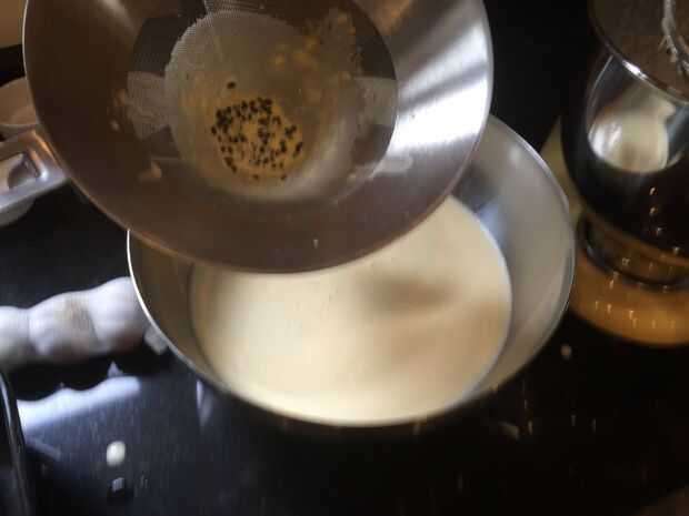Una vez caliente la crema de leche bastante luego reducir la intensidad del batir de huevos etc. y poco a poco Vierta la crema caliente. Poner la mezcla resultante por un colador y tiene un delicado sabor natillas.