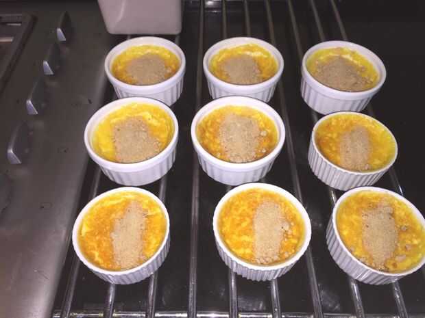 Cuando estés listo para entregar a la mesa para comer, esparcir cada molde uniformemente con parte del azúcar restante, dividir igualmente. Luego utilice un soplete o sentarse los moldes en una parrilla caliente para derretir y caramelice el azúcar. El azúcar rápidamente comenzará a burbuja y derretir, girando pronto a un caramelo dorado.
