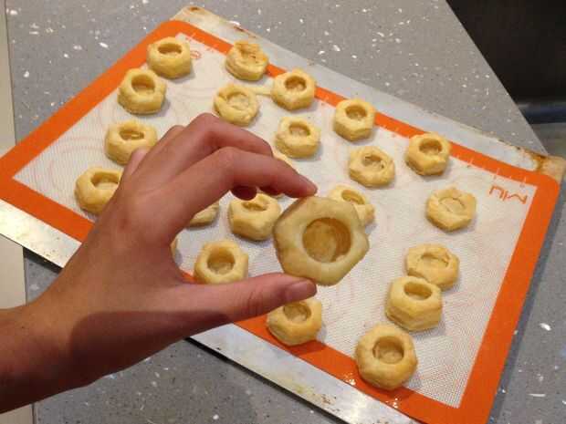 Precalentar el horno a 400F y hornear el hojaldre según las instrucciones en la caja.