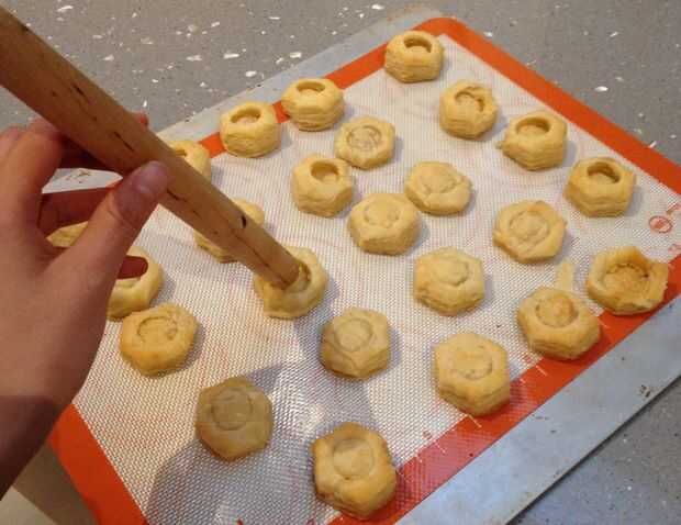 Una vez fuera del horno, usted necesitará usar el mango de una cuchara de madera o el extremo de un rodillo pequeño para empujar en el centro de la concha.