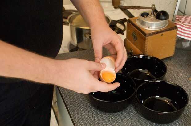 Grieta entonces el huevo abierto y comienzo decantación el blanco de ella. Usted puede deslizar la yema hacia adelante y hacia atrás entre las mitades de cáscara de dos huevo tienes un par de veces para conseguir la mayoría de los blancos fuera de él.