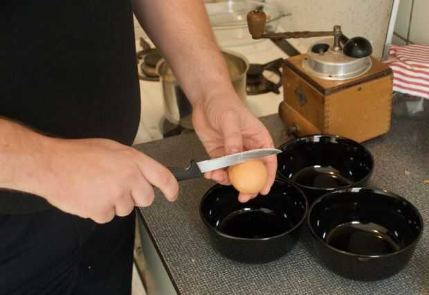 Sobre un cuenco vacío, da su huevo un rap con un cuchillo. Usted quiere un crack recto y limpio en el huevo cáscara, preferentemente a través de la membrana, pero no lo suficientemente profundo como para tocar la yema de huevo.
