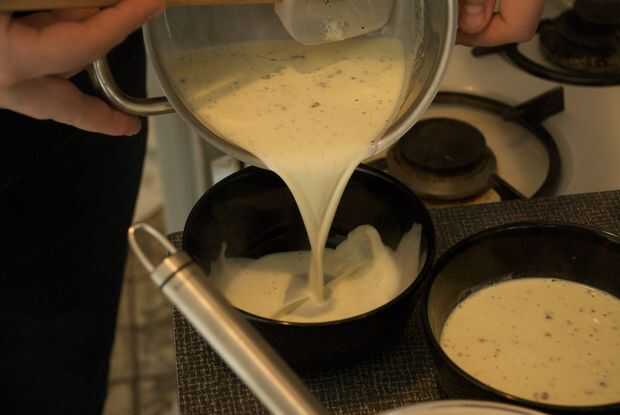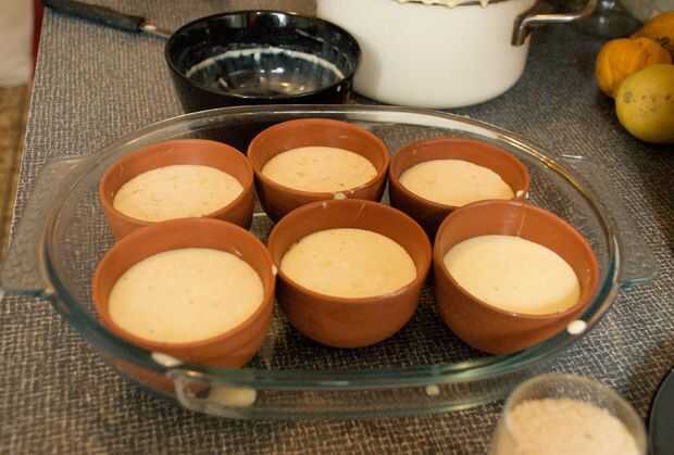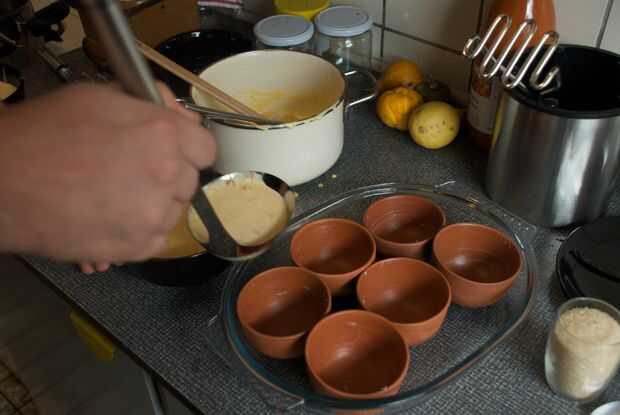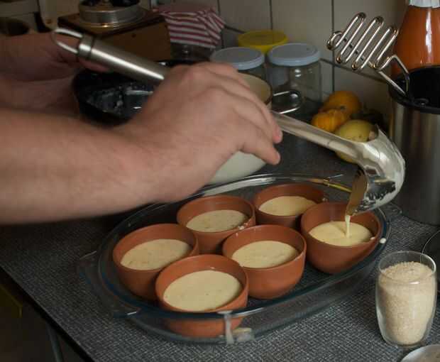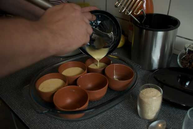 Engrasar los moldes y llenarlos hasta 3/4 de la forma con la mezcla de yema de huevo-azúcar en la crema.