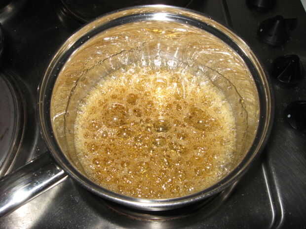 Cuando hierva la solución del azúcar, se formará un jarabe que es más gruesa y larga empieza girando marrón. Ser muy cuidadoso con esto, ya que es muy, muy caliente!