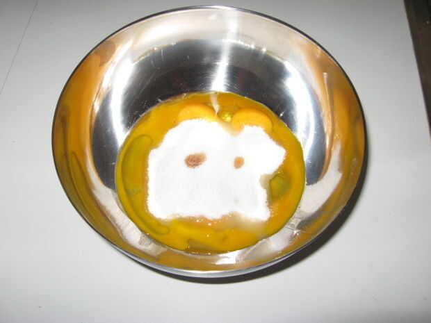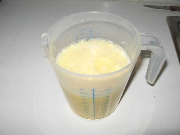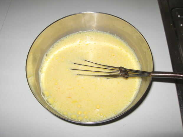 Calentar la leche un poco (no hervir) y mezclar con la mezcla de huevo. Verter la mezcla resultante por un colador (para retirar partes sólidas que pueden dejarse) en una taza de medir (es más fácil verter).