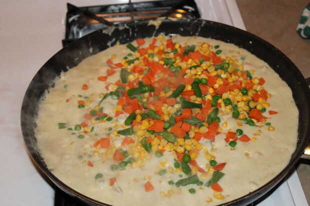 Cuando la pasta está cerca de ser realizado, añadir una bolsa de la congelada mezclada de verduras a la salsa y la salsa continuar la cocción.