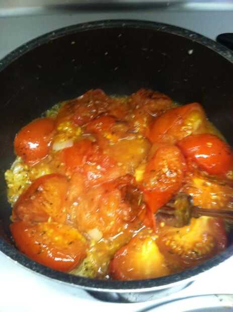 Agregar tomate asado al fuego (si fuego casero asado salsa de desprecio de tomates ya cocidos en) y levantar calor mediano durante 5 minutos. Revolver de vez en cuando.