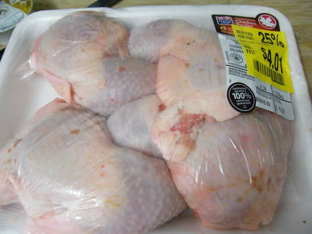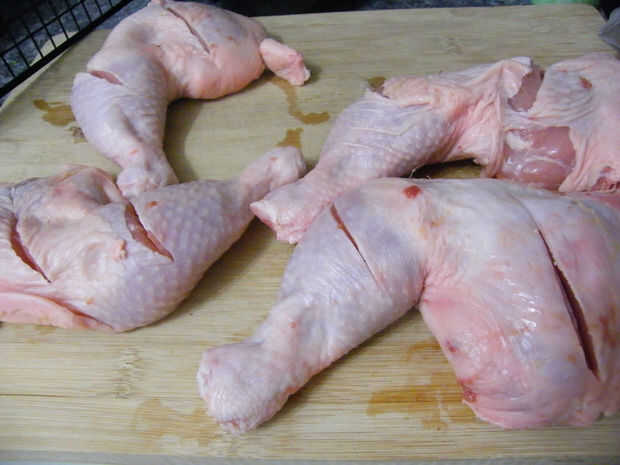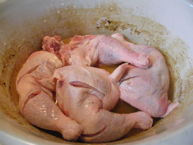 Vierta el caldo de pollo de 1 c y colocar en 4 muslos de pollo lavadas